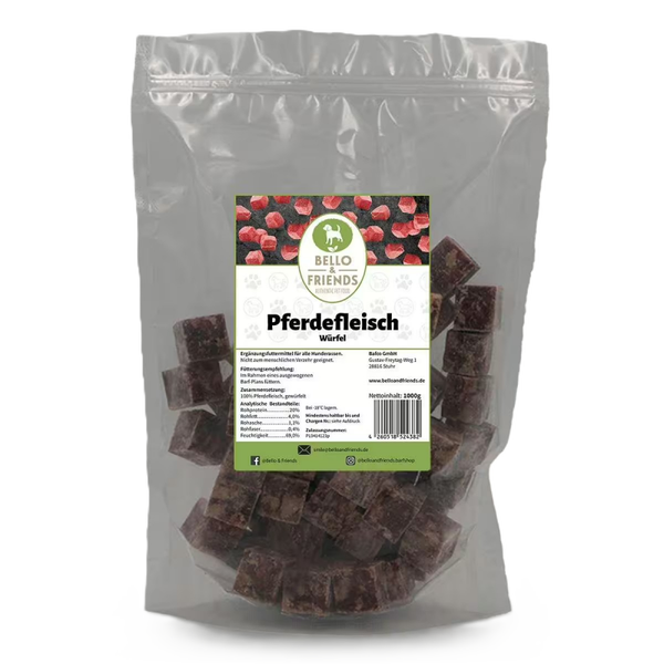 100 % HORSE, ausschließlich Muskelfleisch in hoher Qualität. Pferdefleisch ist hypoallergen und dafür auch für Allergiker und Hunde mit Unverträglichkeiten geeignet.